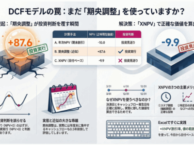 M&Aの現場で、DCF(Discounted Cash Flow)モデルを作成する際、「期央調整」が使われることがよくあります。「期央調整」とは、年 …