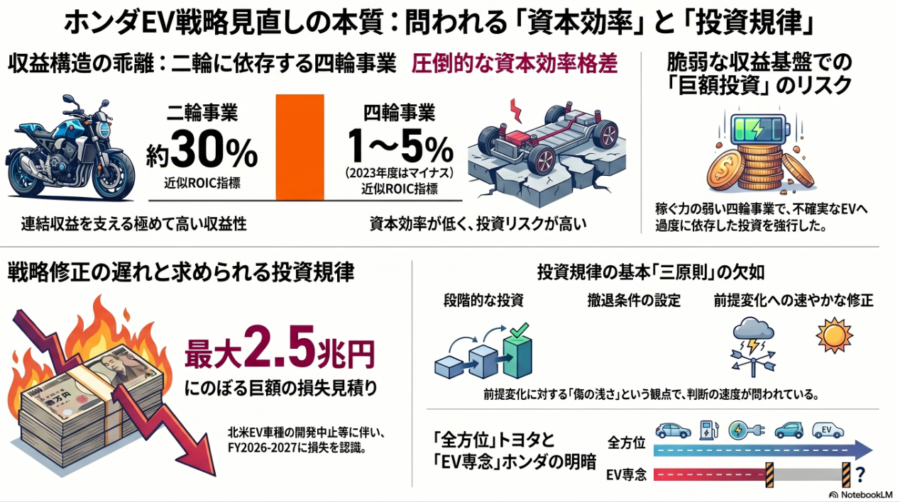 二輪の税前近似指標は30%前後。四輪は1〜5%。この差がある限り、ホンダの連結収益を支えているのは二輪であり、四輪は連結の見た目ほど稼げていません。その四輪に、不確実性の高いEV投資を大きく積んだ結果、最大2.5兆円規模の損失認識に至りました。