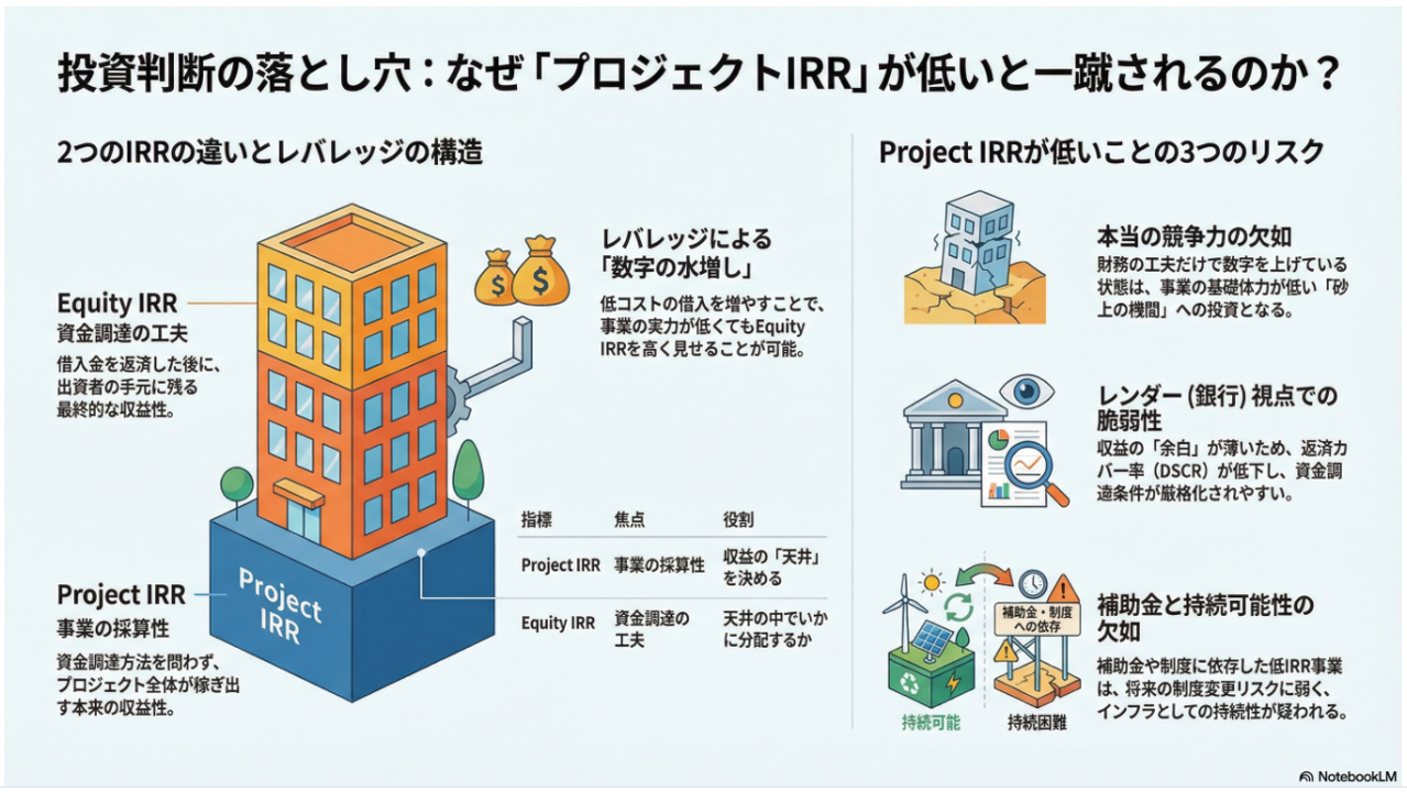 「Project IRRは事業の採算性の天井を示し、Equity IRRはその天井の中でいかに賢く資金調達したかの結果」