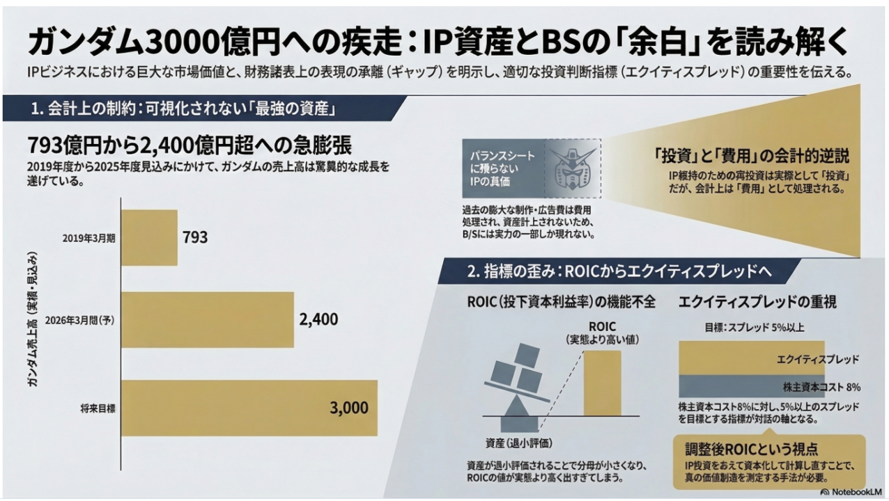 ガンダムというIPを築き上げるために投じられた、過去数十年の膨大な制作費やマーケティングコスト。これらは多くがその都度PL上で費用処理されており、現在のバランスシートの資産には十分には計上されていません。