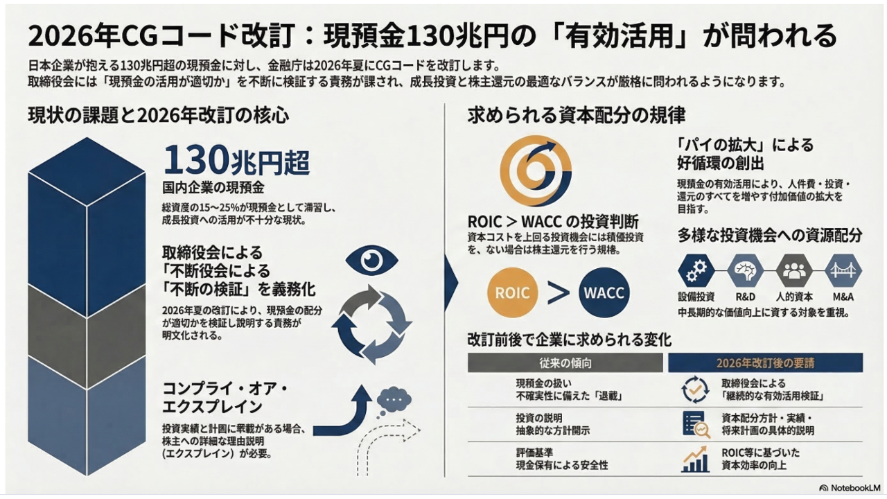 「成長投資に回せ」「株主に還元しろ」――こうした声が強まる中、金融庁は2026年夏頃にコーポレートガバナンス・コード(CGコード)の改訂を予定しており、その目玉が「現預金の有効活用検証」です。