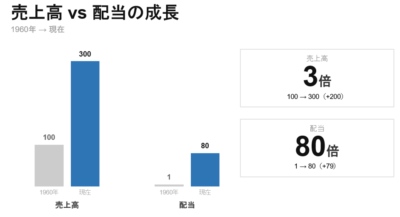 下図のような簡単な例で考えてみましょう。例えば、1960年において、売上高は100万円、配当は1万円です。それが現在では、それぞれ300万円と80万円に増加しているとします。