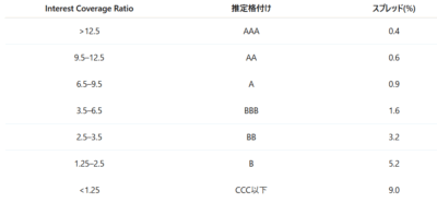 カバレッジ比率から、対応する格付けとスプレッドを以下のように読み替えます。