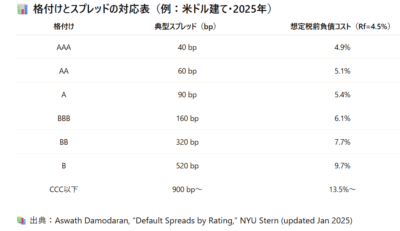 格付けは、企業の債務返済能力の定量的な評価です。 投資家や金融機関は、格付けをもとにリスクに見合った金利(スプレッド)を設定します。 したがって、格付けは「信用スプレッド」を見積もるうえで最も直接的な手がかりになります。格付けが公表されている企業では、以下の5ステップで負債コストを導きます。