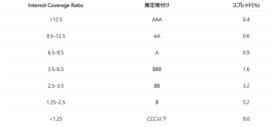 カバレッジ比率から、対応する格付けとスプレッドを以下のように読み替えます。