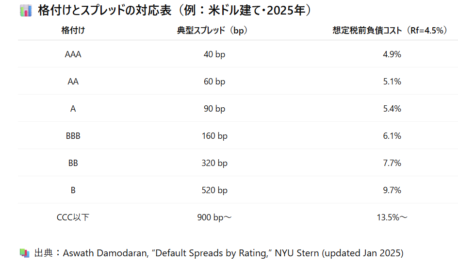 以下は、格付けごとの典型的なスプレッド(bp)と、リスクフリーレート(Rf)=4.5%と仮定した場合の想定税前負債コストの例です。