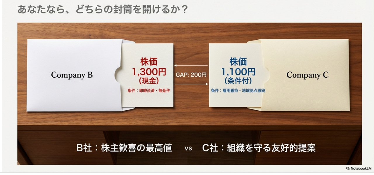 朝、二通の買収提案が届きます。B社は1株1,300円を提示。現金対価、主要条件なし。株主は間違いなく喜ぶ価格です。一方、C社は1株1,100円。ただし「従業員の雇用維持」「地域拠点の継続」を約束しています。