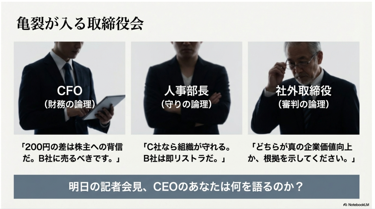 取締役会では意見が割れています。CFOは「200円の差は株主への背信だ」と主張します。人事部長は「C社なら組織が守れる。B社は即リストラだ」と訴えます。社外取締役は冷静に問います。「どちらが真の企業価値向上か、根拠を示してください」。