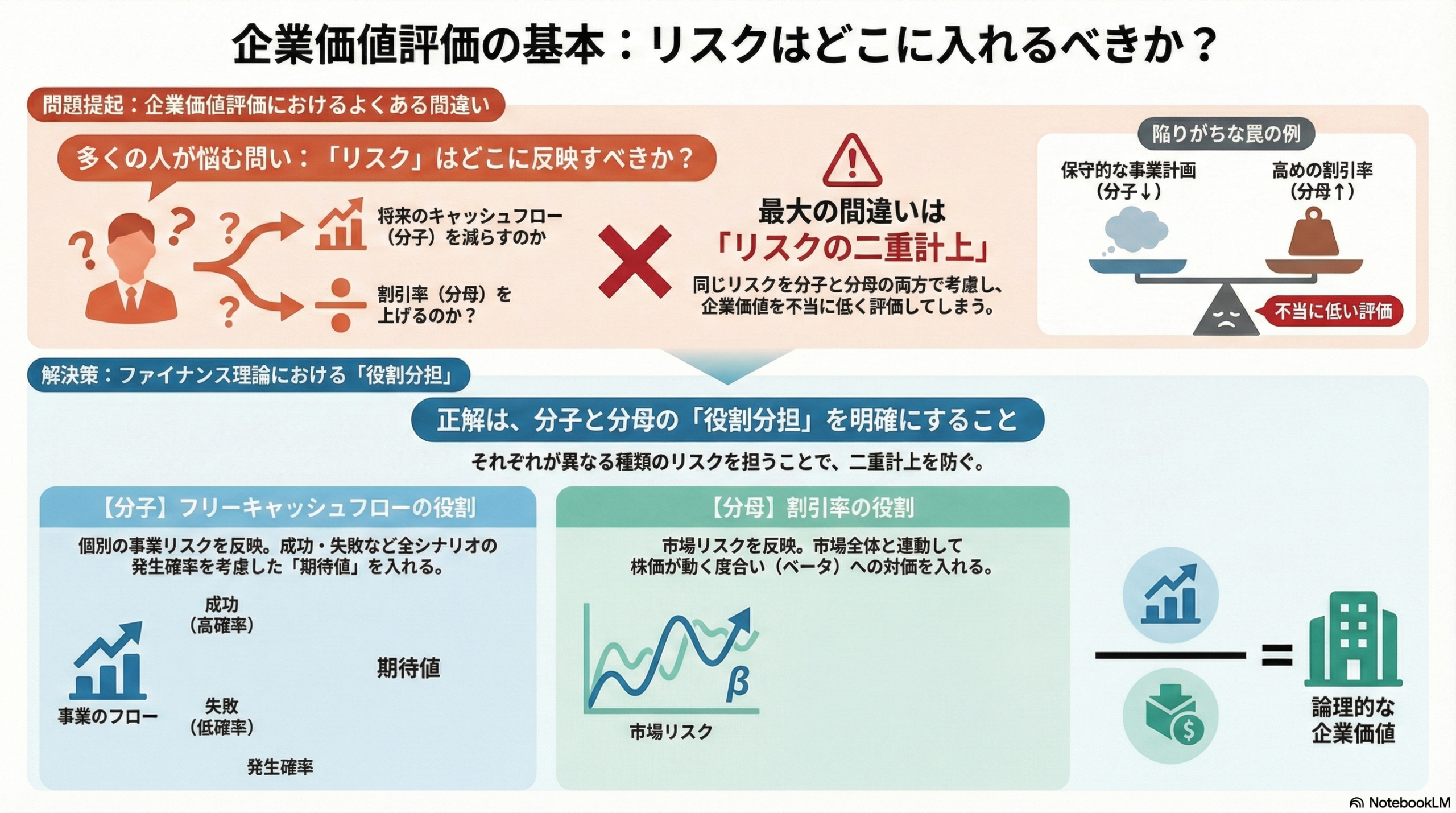 これでは、同じリスクを分子と分母の両方で引いてしまい、企業価値を不当に低く見積もることになります。