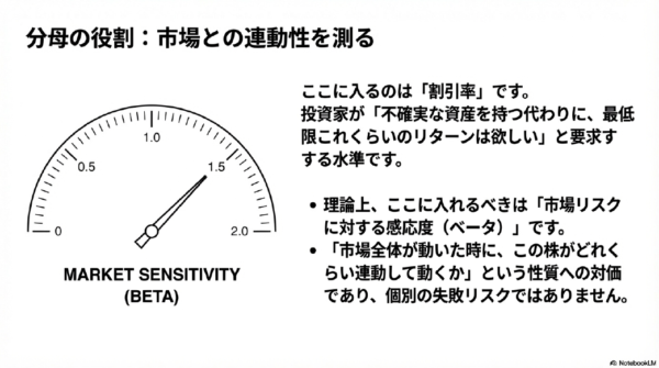 ここには「割引率」が入ります。これは投資家が「この不確実な資産を持つ代わりに、最低限これくらいのリターンは欲しい」と要求する水準です。理論上、ここに入れるべきは「市場リスクに対する感応度(ベータ)」です。つまり、市場全体が動いた時に、この株がどれくらい連動して動くか、という性質に対する対価です。