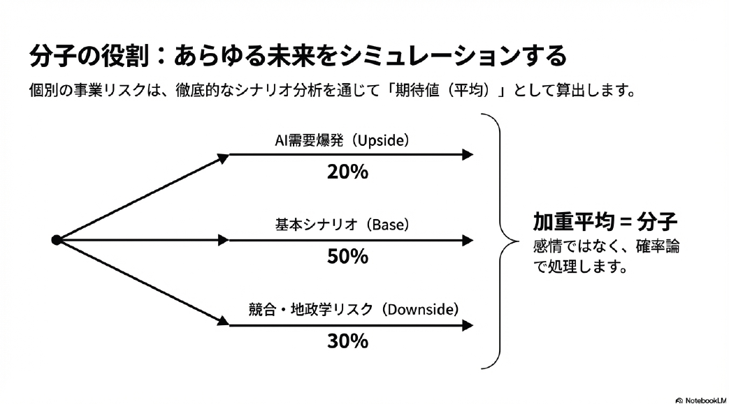 ここでは、あらゆる可能性をシミュレーションします。「AI需要が爆発的に続くシナリオ」「競合にシェアを奪われるシナリオ」「地政学リスクで供給が止まるシナリオ」。